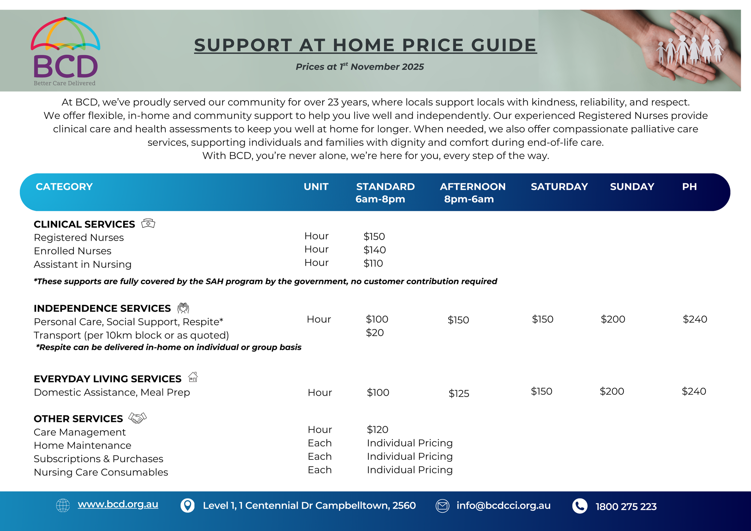 Click on the image to download BCD’s Support at Home Price Guide
